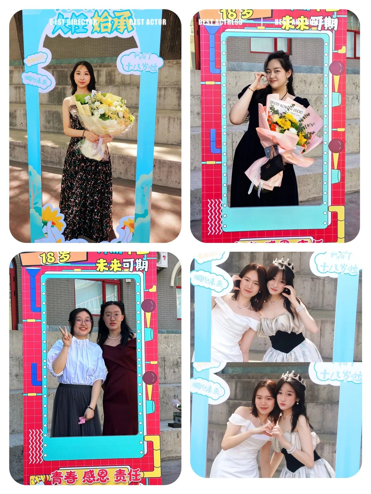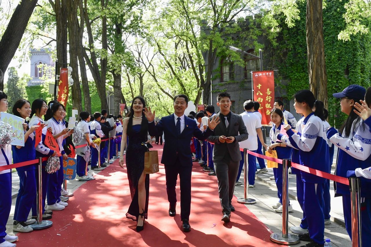 主甬路上,写有十八岁寄语的旗帜迎风飘扬,红毯从天钦楼延伸到成人门,寓意着同学们一路走过稚嫩的孩童时期、懵懂的少年时期,终于迎来18岁。高三学子身着正装、礼服,在父母师长的陪伴下,英姿飒爽、精神抖擞地走过红毯,祝愿18岁的你们,未来可期!